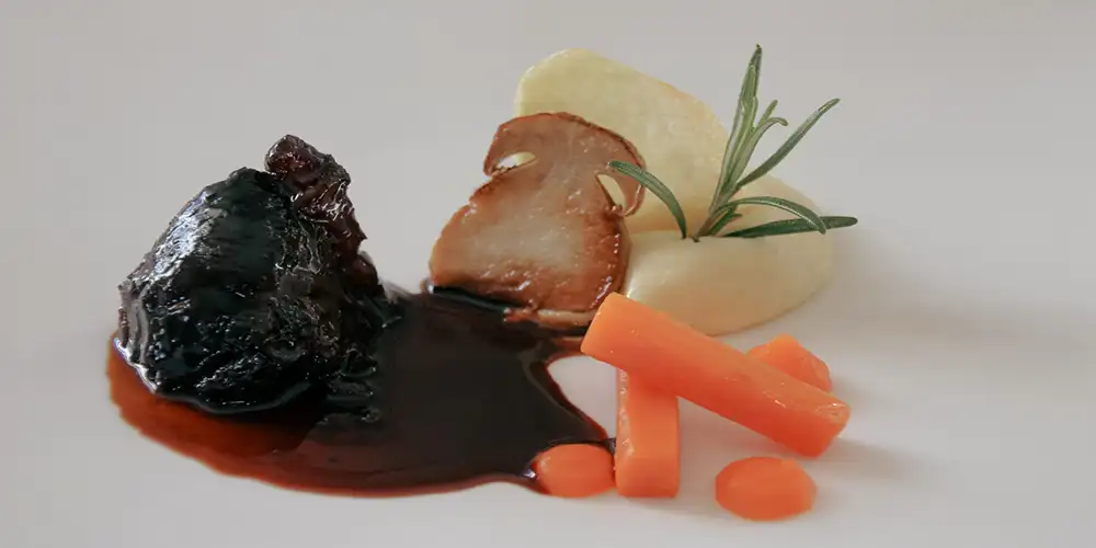 - Im Ofen bei 160°C zugedeckt weich schmoren (ca. 2 - 3 Stunden). Immer wieder mit der Sauce übergiessen.